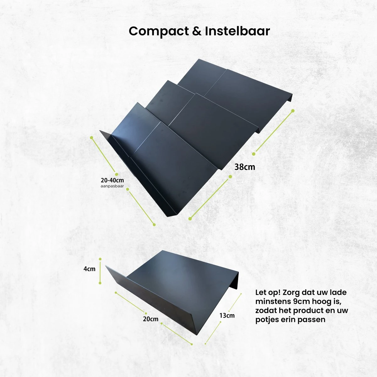 Let op: zorg dat jouw lade minstens 9 cm hoog is, zodat het product en jouw kruidenpotjes erin passen.