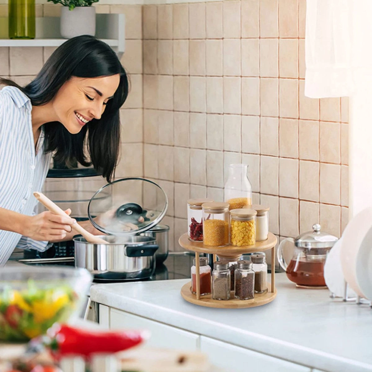 Dit bamboe houten 360 graden draaibare 2-Laags Kruiden carrousel / Fruitrek heeft een tijdloze uitstraling, en past daarom in elke keuken. Deze luxe keukenaccessoire mag u eigenlijk niet missen in uw keuken.