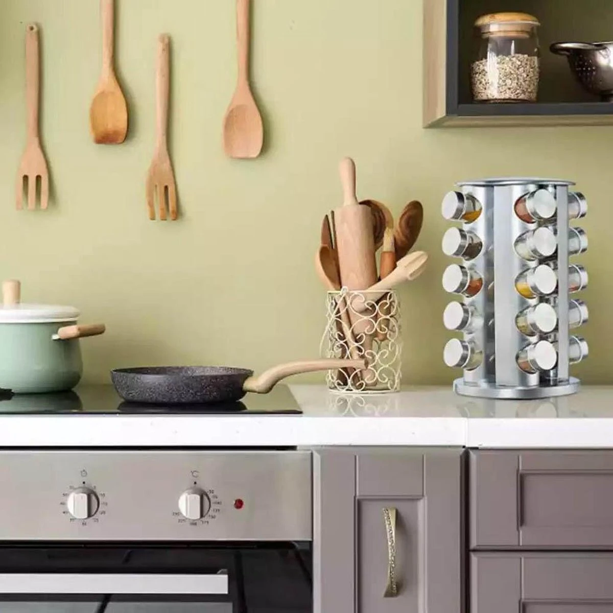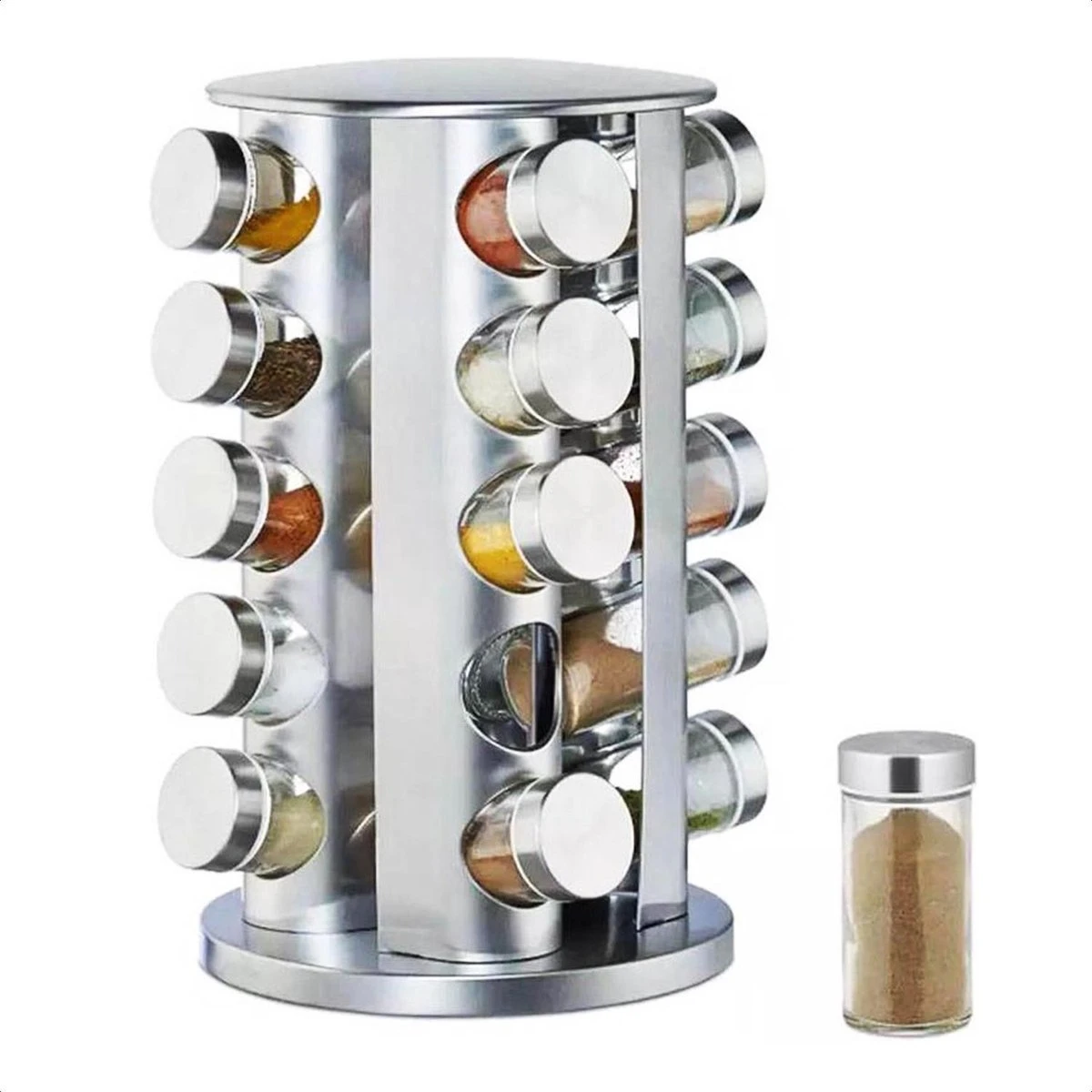 Het is afgelopen met de chaos in het keukenkastje. De moderne kruidencarrousel van roestvrij staal zorgt voor orde op het aanrecht. 20 glazen potjes voor het bewaren van al je kruiden zoals curry, paprikapoeder en zout. Onder het kruidenrekje is een kunststof schijf gemonteerd die het mogelijk maakt het rek te draaien. Zo kom je heel makkelijk bij al je kruidenpotjes. De glazen potjes zijn verdeeld over 5 etages en kunnen dankzij de strooigaatjes direct als strooipotjes worden gebruikt.