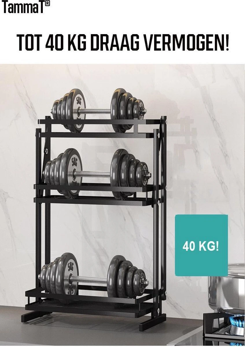 Deze TammaT® kruidenrek is precies wat je nodig hebt in de keuken. Bespaar geld en ruimte met ons staand kruidenrek. Tammat® 2 of 3-laags kruiden heeft bredere ruimte om genoeg accessoires te dragen. Dit unieke Kruidenrek komt met grote messenhouder, bestekhouder, keukenrol houder en ophang haakjes voor je keukengerei. Kruidenrek is inklapbaar, waardoor het met gemak kunt verplaatsen, dat is ideaal wanneer je de rek wilt verplaatsen om te schoonmaken en/of tijdelijk niet wilt gebruiken.